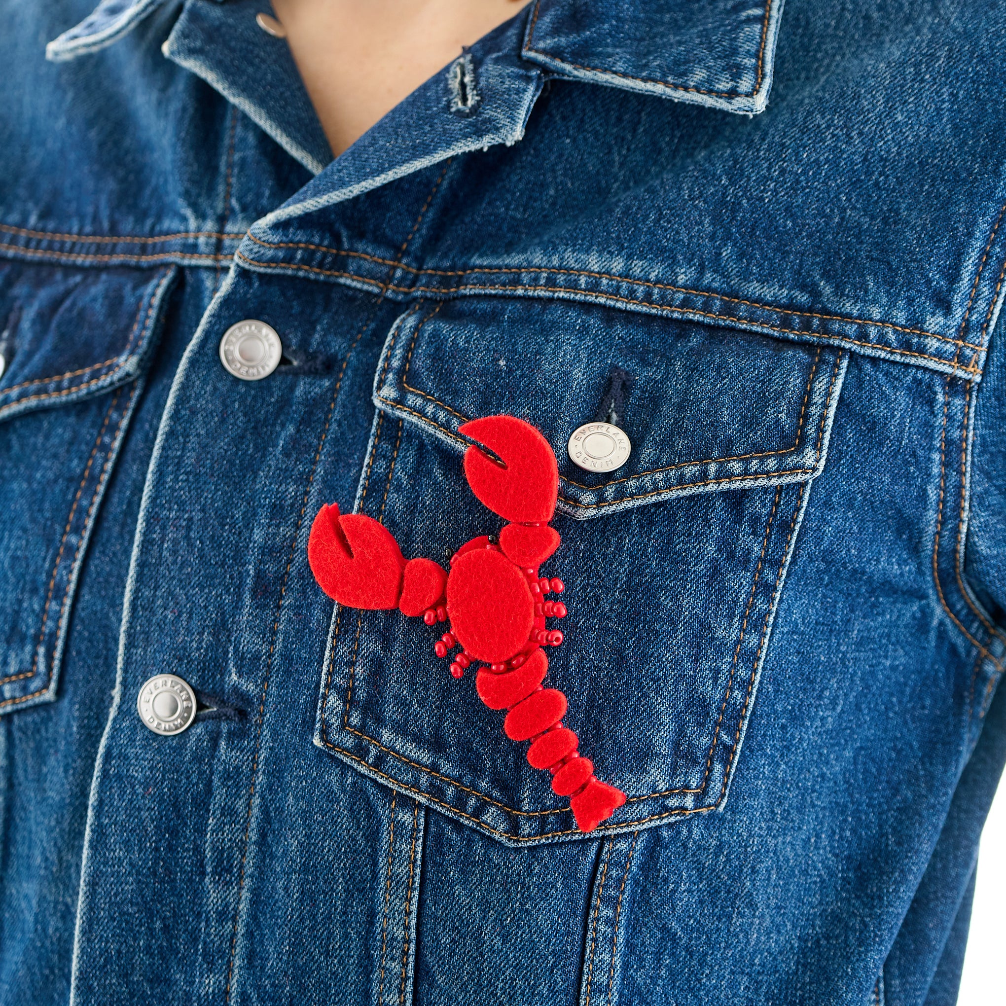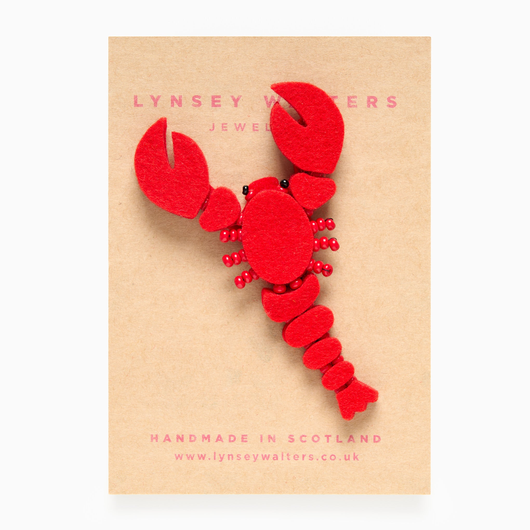 Red felt lobster brooch with bead detail by Scottish designer Lynsey Walters