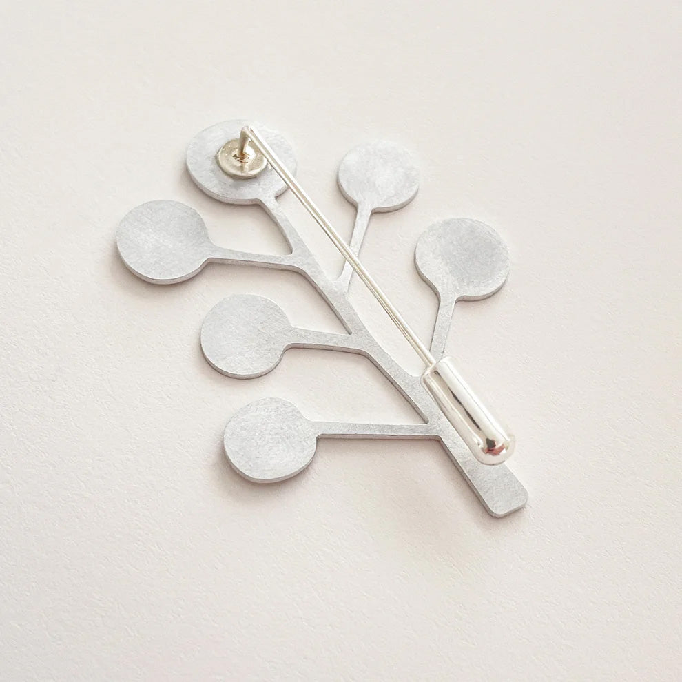 Crafted in matte anodised aluminium, this pin brooch has a silver plated stick pin and protector. Created collaboratively between Tom Pigeon's metal workshop in the West of Scotland and their canal-side studio in Manchester.