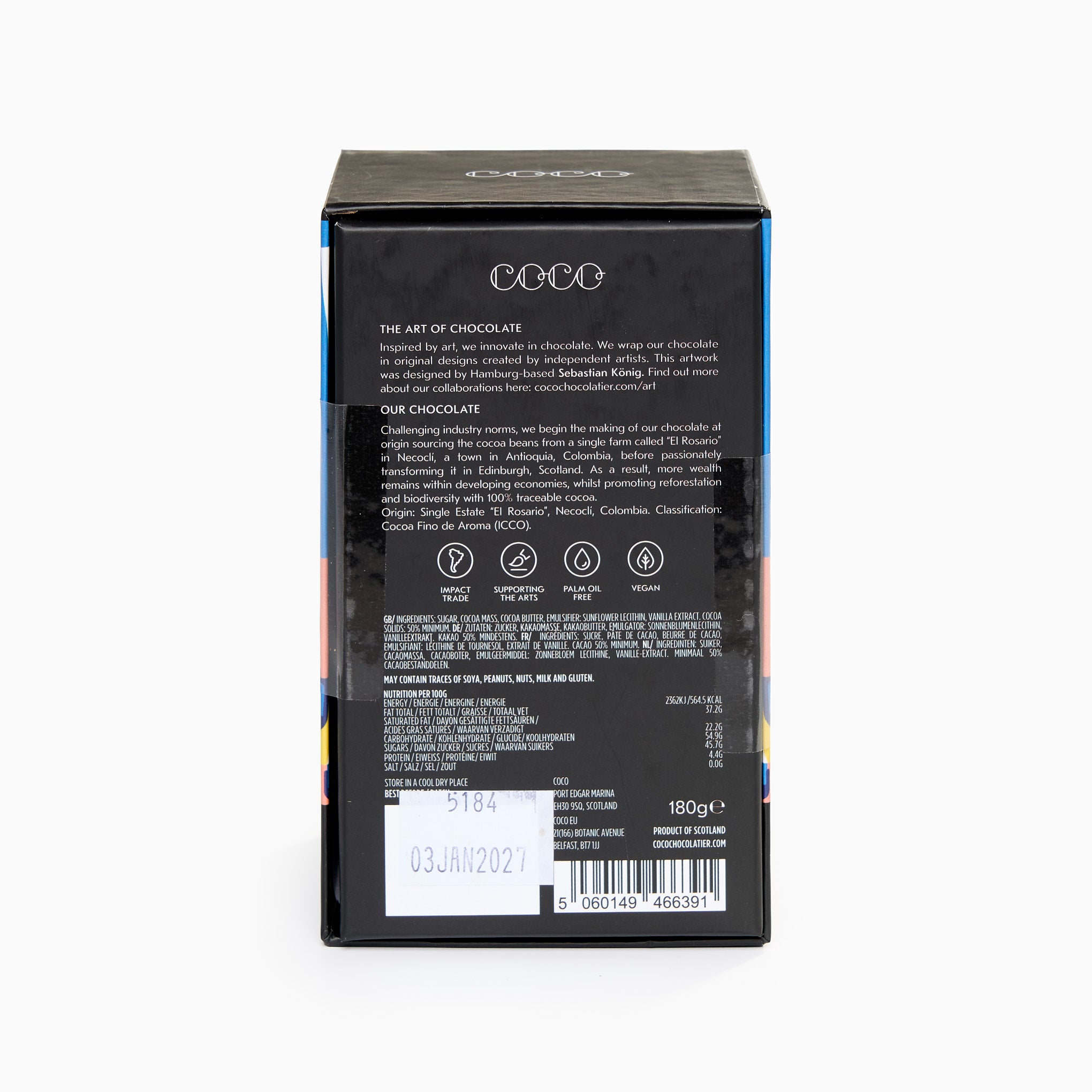 Elegant dark chocolate Single Estate 50% cacao content made with fine flavour cocoa beans from a single farm called "El Rosario" located in the Necocli region on the north-eastern coast of Colombia; distinctive cacao notes with the perfect balance between sweetness and bitter tones