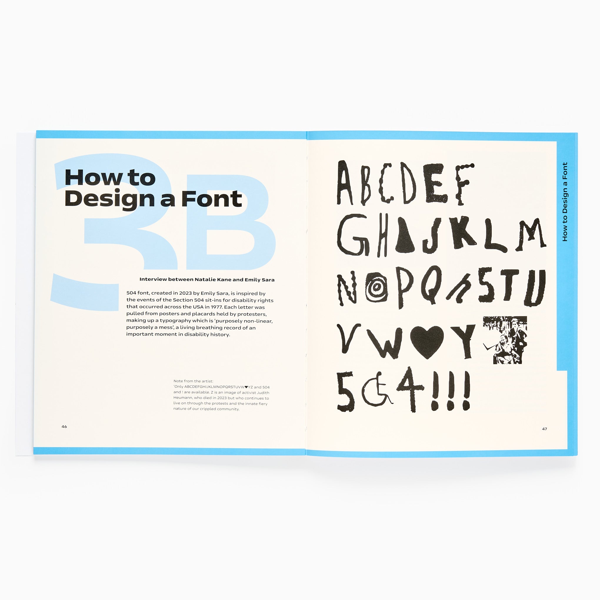 Design and Disability exhibition catalogue open to typography spread exploring accessible font design.