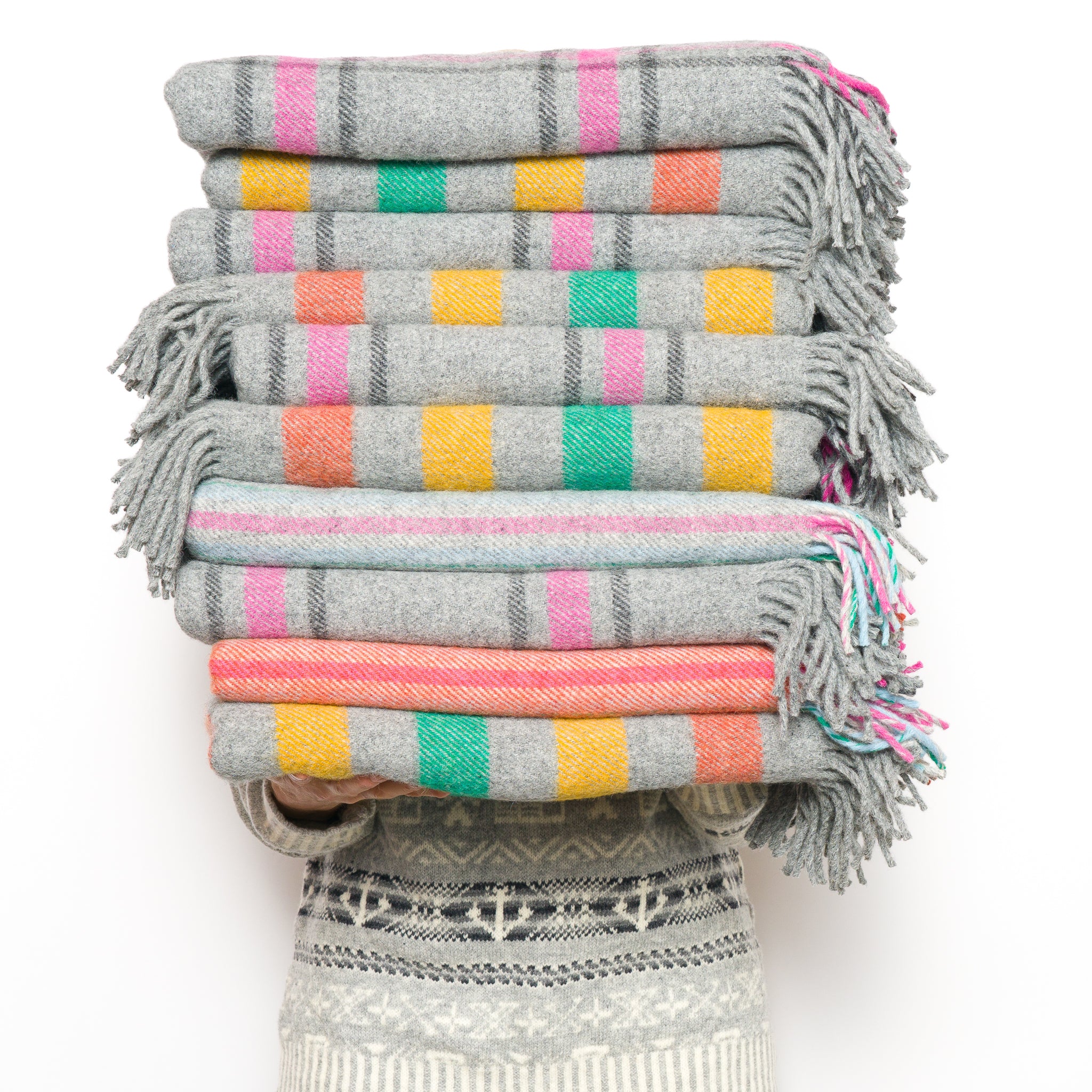 This quietly colourful and luxurious blanket is ideal for use at home or outdoors. This design is called Duart and is a bold weft stripe of grey, orange, emerald and gold.