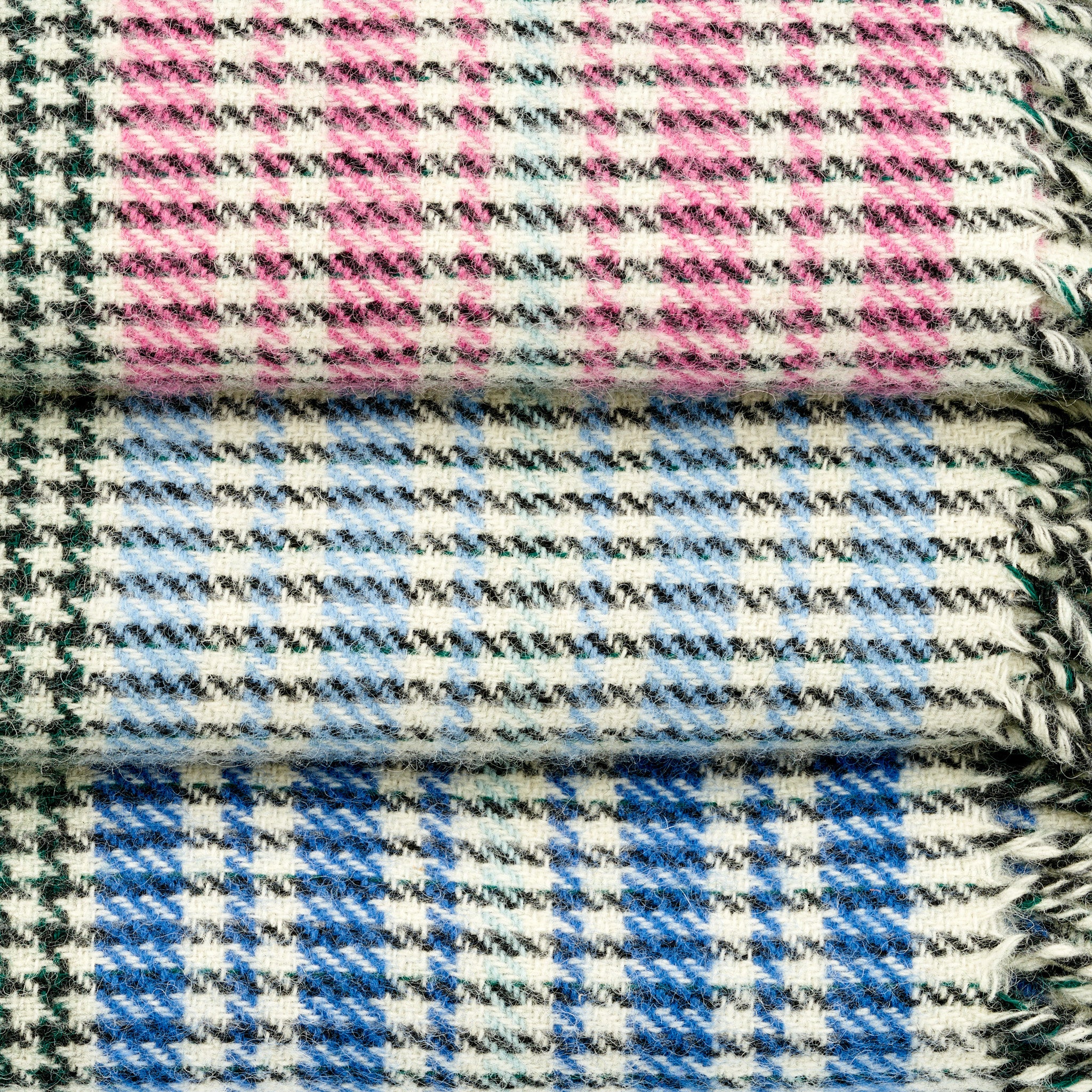 Stag & Bruce Plaid wool blankets stacked, pink, light blue, royal blue.